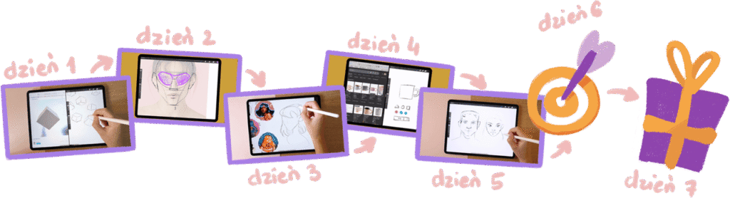 Przez 7 dni otrzymuj krótkie digitalowe lekcje i ćwiczenia, które pomogą Ci wyrobić nawyk rysowania i codziennie dowozić małe efekty.